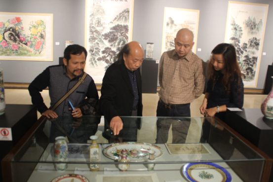 劉致遠作為國畫、廣彩陶藝大師劉群興之子,也自幼隨父學習國畫及陶瓷制作,其廣彩作品色澤鮮明,絢麗多彩,既師吸收統繪畫技法,又仿造西洋畫法,頗具嶺南畫派折衷中西的精髓。其國畫松樹題材的創作,盡顯崇山峻嶺之中,松之勁峭與水之嫵媚,其繪制的山水題材彩瓷既有山河磅礴之態勢、又具匠心細刻之精致。此次兩位嶺南畫派傳承人在此展出他們的作品,內容、風格各異,交相輝映,很好地承傳了嶺南畫派的要義。