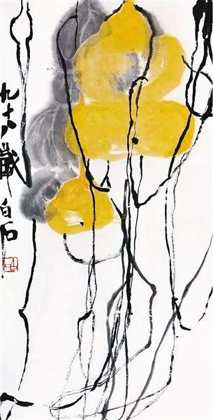 齊白石的《葫蘆》,被稱為是齊白石的絕筆,據說當時齊白石為了畫這幅畫,一天早晨起來,沒有人攙扶,他自己從臥室踉踉蹌蹌地走進畫室,站在桌前,擼起袖子,畫下了這一幅畫。據畫家李可染回憶,當時的齊白石已經是老糊涂了,“九”字不知道該怎么寫,到了“歲”就直接寫錯了,只能夠憑自己的直覺畫畫,即便是畫了一輩子的畫,但是到最后由于體力和腦力的不支,實在是畫不出來了。齊白石一開始用黃墨去畫葫蘆,畫下正確的一筆,一大一小,一前一后,一上一下。但當他接著去畫葉子的時候出錯了,把葉子順即也畫成了葫蘆,且葫蘆留白處冒出兩筆淡墨,就好像葫蘆被打了兩個洞。當畫藤蔓時,又恍惚了,畫著畫著又成葫蘆了。齊白石老人在做這幅畫時已經是精力透支了,能畫出樣子來已經實屬不易了,但是我們可以看到,其實齊老畫的這幅畫是別有一番風韻在的,比如說他畫的藤蔓,這藤蔓真是絕了,能夠在不知不覺中畫出葫蘆的成熟、滄桑,把經過風吹雨打后形成的那種彎曲,表現得淋漓盡致。