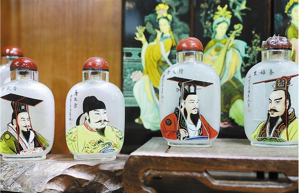談及創作過程,楊藝說,鼻煙壺內畫的制作,一般是在水晶壺或素玻璃壺內壁,用特制的細筆,蘸取少許墨汁顏料,從小口中深入瓶中,反手作畫。創作內畫,在常人看來,不可思議之處是有限的空間以及需要反手作畫,這也是每一個內畫師面臨的主要難題所在,“創作內畫時,需要在這盈寸天地間做到手指和筆桿揮灑自如,這極其考驗一個人的耐性。一手執壺,一手作畫,作畫時需要在壺內反手描繪,如此,才能讓人們在外部看到正面的畫像結構。”內畫的難度還在于,要長期低頭畫畫,因此還導致頸椎疼痛,中途為了治療疼痛休畫了好長一段時間。