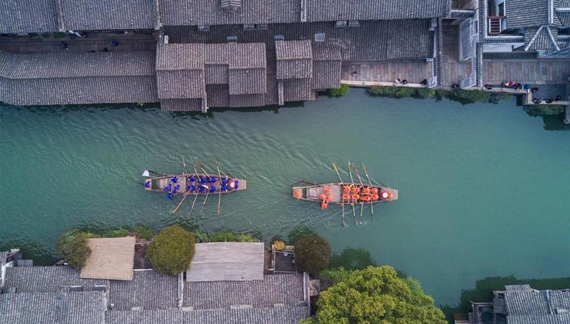 3月29日,烏鎮水鄉百姓在烏鎮西柵景區參加名為“踏白船”的傳統水上競技活動,吸引游客前來感受水鄉獨特的民俗風情。