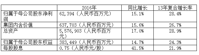 中國平安保險(集團)股份有限公司(以下簡稱“中國平安”、“平安”、“集團”或“公司”,股票代號:香港證券交易所2318,上海證券交易所601318)公布截至2016年12月31日全年業績。