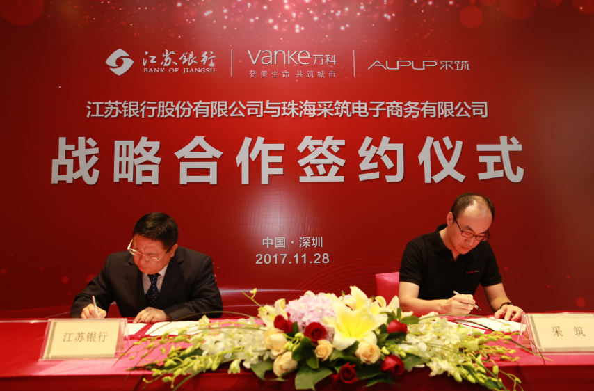 11月28日,采筑電商平臺發布會暨與江蘇銀行戰略合作協議簽約儀式在前海萬科國際會議中心成功舉行。萬科集團副總裁王蘊女士和江蘇銀行運營總監趙輝先生受邀出席儀式并致辭,江蘇銀行行長助理兼深圳分行行長李敏與采筑電商平臺總經理都軍代表雙方簽署戰略合作協議。總行公司業務部周愛國總經理、深圳分行張慶光副行長等一行出席發布會暨簽約儀式。
