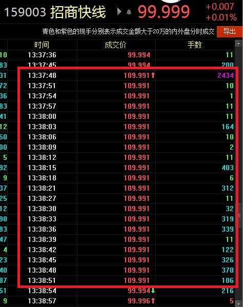 根據Wind數據顯示,招商快線13日的開盤價格為99.991,此后一直在99.990—99.995之間波動,但到13:37:48突然出現了2434手的大單,成交價格為109.991,在一分鐘左右的時間,同一價格上又陸續出現了20筆成交,隨后價格恢復到99.994。