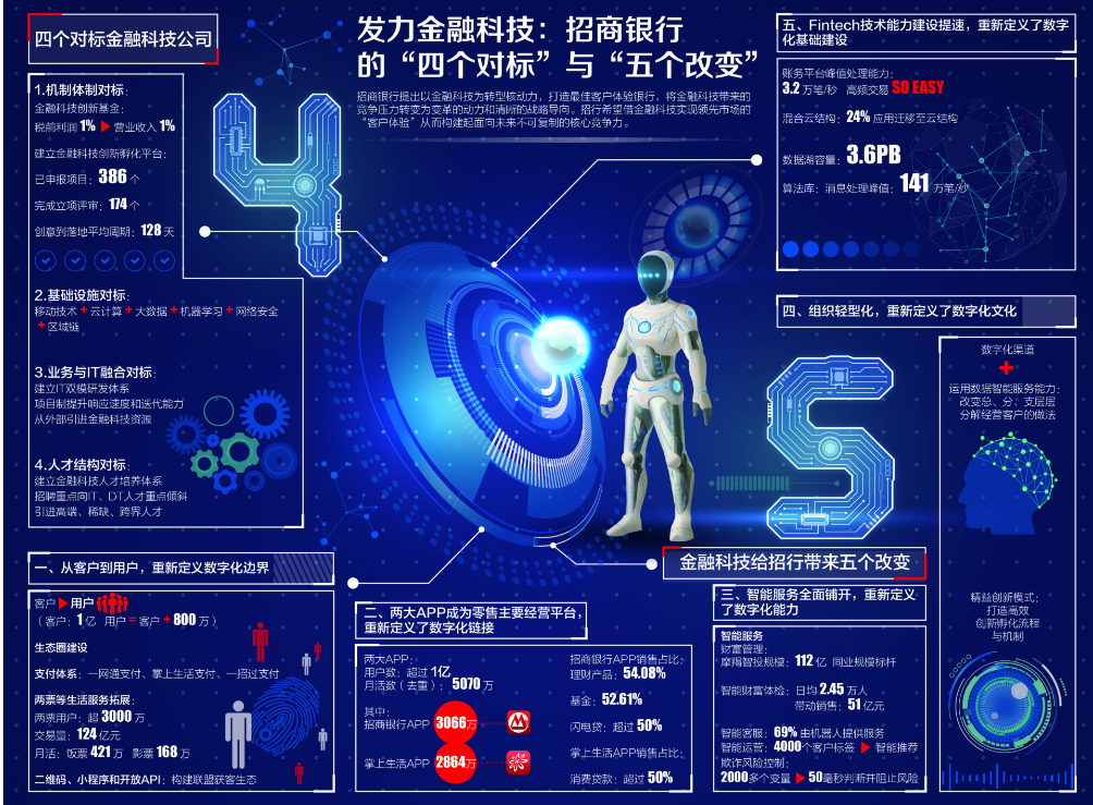 “核動(dòng)力”彰顯出金融科技的巨大威力。招商銀行認(rèn)為,“唯一可能從根本上改變和顛覆銀行商業(yè)模式的只會(huì)是科技。”近幾年科技正加速重塑金融行業(yè)的版圖,一場(chǎng)行業(yè)巨變已悄然發(fā)生,且場(chǎng)內(nèi)競(jìng)爭(zhēng)者不僅包括傳統(tǒng)金融機(jī)構(gòu),還有眾多新生的金融科技公司。對(duì)此,招商銀行秉承開(kāi)放創(chuàng)新的心態(tài),并非將憑借技術(shù)優(yōu)勢(shì)進(jìn)入金融領(lǐng)域的技術(shù)公司視為敵人,而是合縱連橫,并將其作為全面對(duì)標(biāo)的對(duì)象,將金融科技帶來(lái)的競(jìng)爭(zhēng)壓力轉(zhuǎn)變?yōu)樽兏锏木o迫感和清晰的戰(zhàn)略導(dǎo)向。