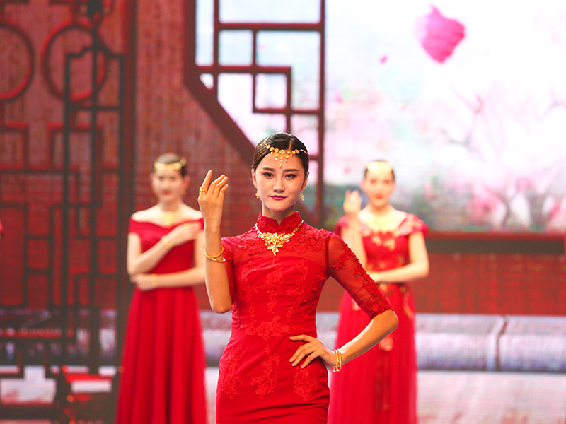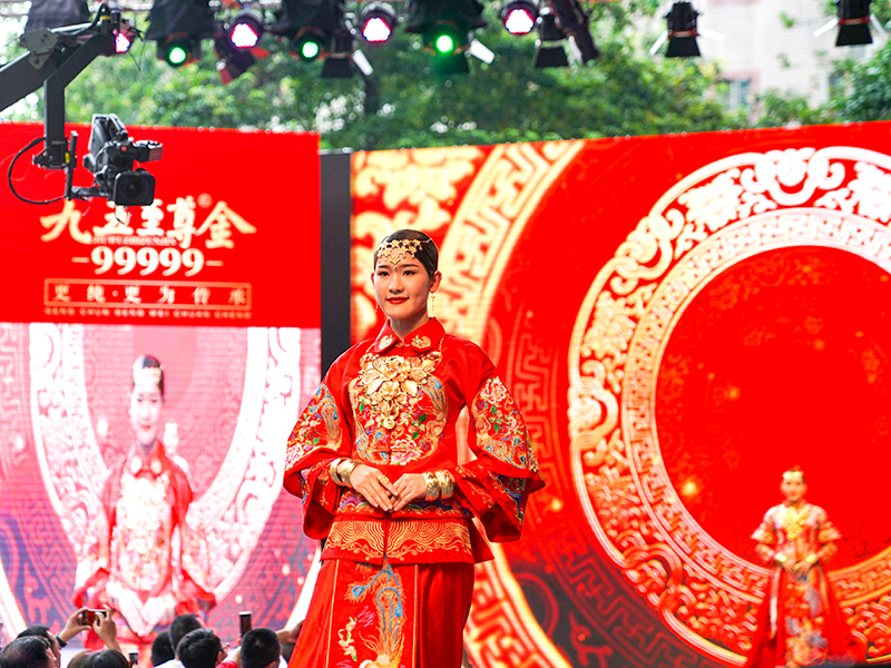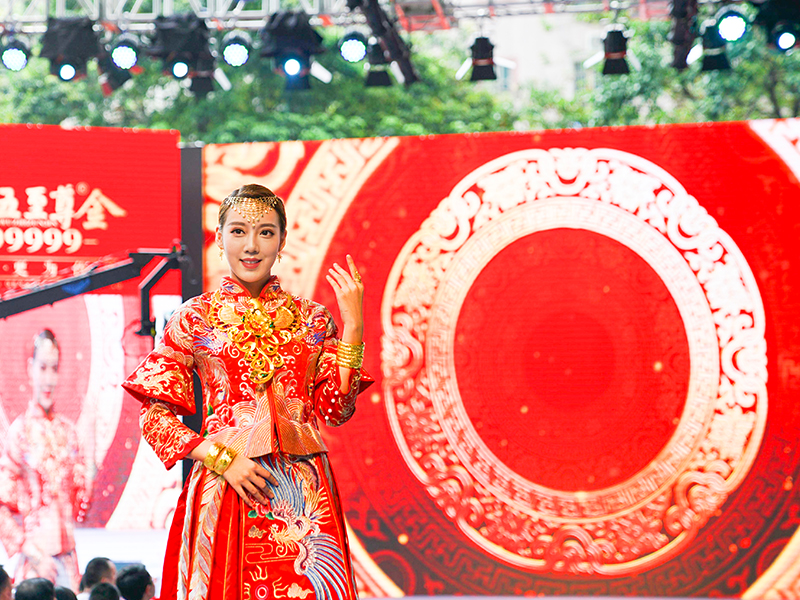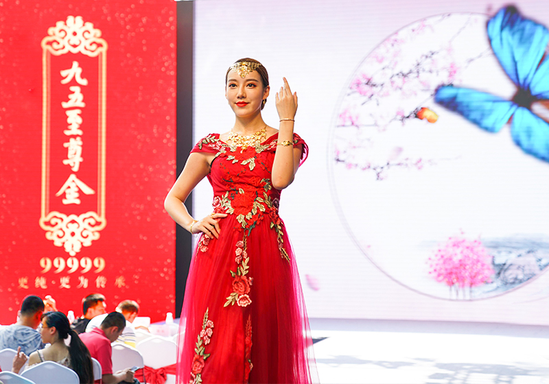 黃金文化與中國傳統婚慶文化淵源久遠,從古自今,黃金有情比金堅之意,有滿滿的喜慶之感,在嫁娶之時通常作為聘禮中的重頭戲。結婚三金通常指的是項鏈、手鐲、戒指,寓意夫妻情比金堅,一生一世永相隨之意,因此這美好的寄愿習俗一直被傳承至今。黃金又是財富、身份的象征,結婚佩戴黃金首飾,彰顯家族的財富、地位與榮譽,飽含家族人濃郁的情感與欣喜,可代代傳承!九五至尊金至囍新娘演繹的中華黃金婚慶文化,唯美唯俏,牽動著每個人的心,掀起了中華黃金婚慶文化的熱潮。