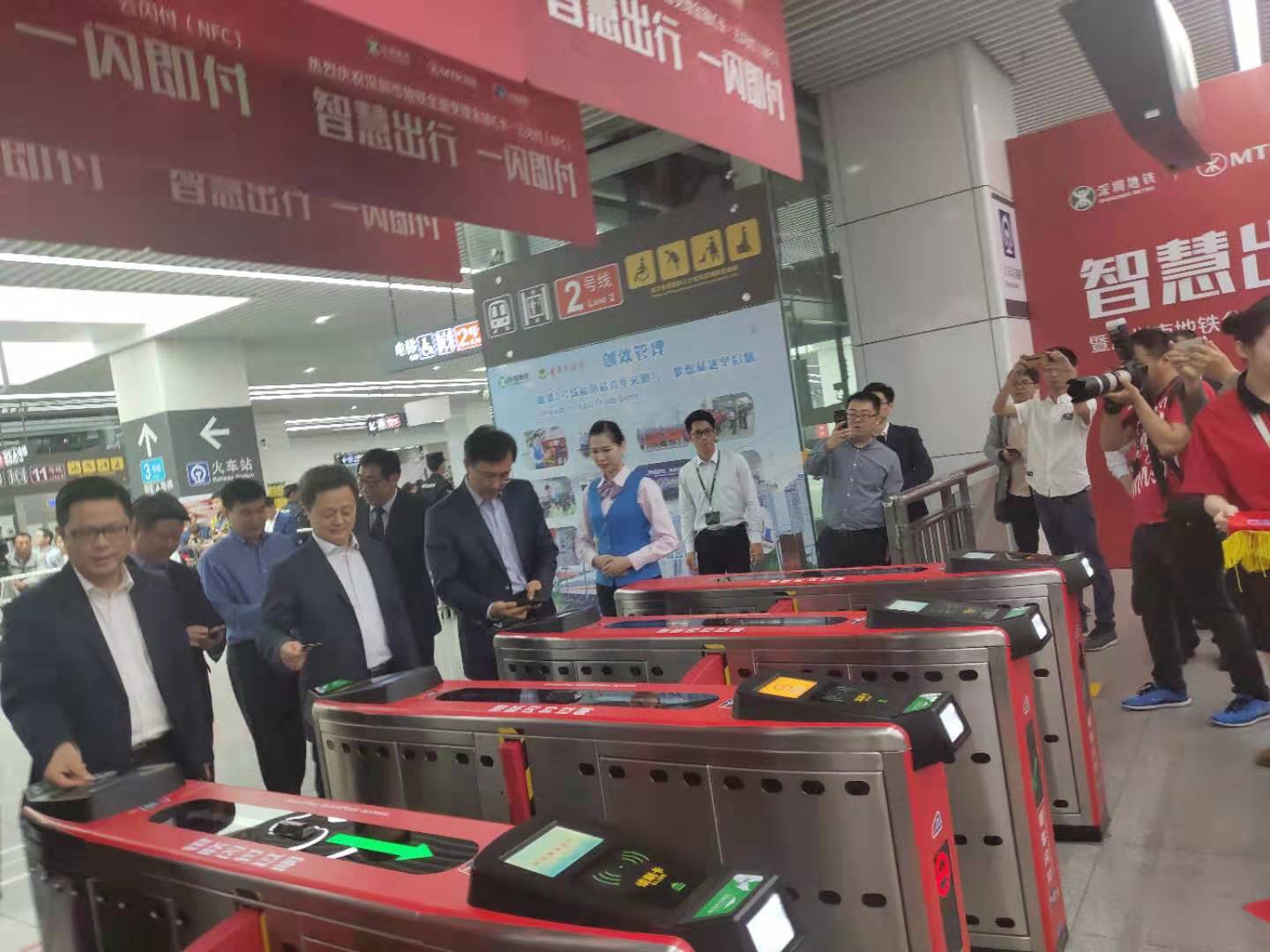3月1日上午,五洲賓館內舉行了“深圳市地鐵金融IC卡過閘服務”的啟動儀式。中國人民銀行副行長范一飛、深圳市人民政府副市長艾學峰、招商銀行總行副行長劉建軍、中國銀聯董事長邵伏軍、招商銀行深圳分行行長岳鷹、深圳地鐵董事長辛杰、港鐵(深圳)總經理黃琨暐等相關領導出席了啟動儀式,并共同點亮LED燈幕,宣告深圳市地鐵8條線路的所有車站正式啟用過閘功能。