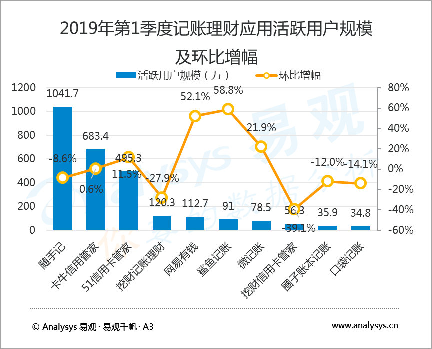 5月24日,知名互聯網數據研究機構易觀 Analysys發布了2019年第1季度記賬理財行業報告,數據顯示,2019年第1季度,在國內記賬類應用中,隨手記以1041.7萬活躍用戶規模蟬聯榜首,卡牛信用管家和51信用卡管家分別以683.4萬和495.3萬活躍用戶規模居行業二、三位。
