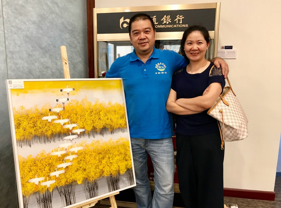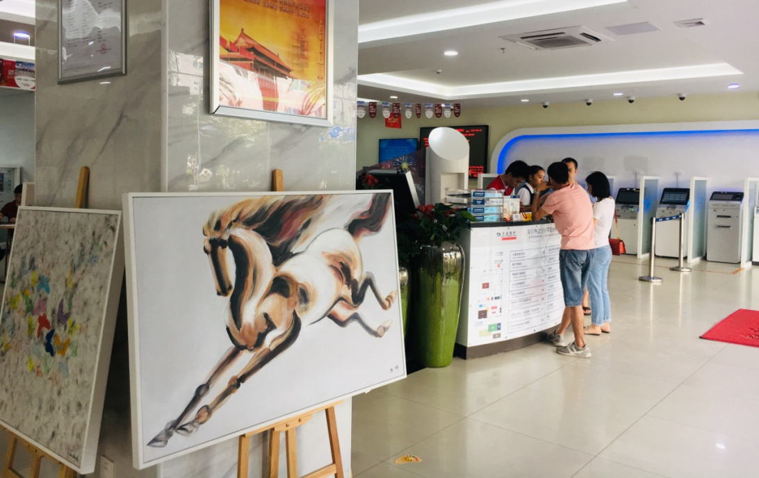 走進交通銀行深圳布吉支行,您的目光一定首先會被陳列廳堂的油畫作品吸引。這些油畫是布吉支行用于精準扶貧的義賣作品,用來幫助河源市紫金縣禮坑村許大爺家庭。支行精準扶貧工作已經進入第三個年頭,2019年6月,支行利用啟動基金向畫商重新購置了油畫作品。新添置的油畫作品擺放于支行大廳,結合總行廳堂一體化改造,支行廳堂呈現出全新面貌。