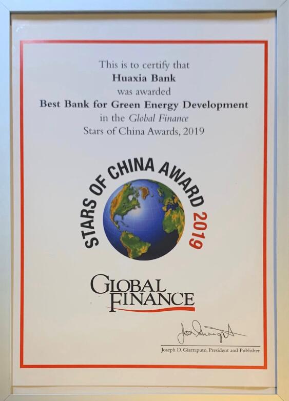 11月11日,在美國《環球金融》雜志2019年“中國之星”頒獎儀式上,華夏銀行憑借綠色金融支持清潔能源發展的突出表現,再次獲得了“最佳綠色能源開發銀行獎”。