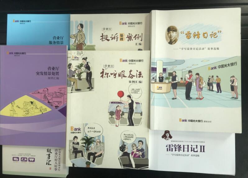 光大銀行深圳分行在組織開展上述活動中發現,一線員工用樸素的文字記述著服務客戶的點滴事例,詮釋著對優質服務的理解和追求,弘揚著具有光大特色的家園文化、陽光文化,字里行間飽含著對光大事業的忠誠和熱愛,看到了員工中蘊含著巨大的工作熱情和創造力。為更好鼓勵員工積極性,在深圳分行領導支持下,深圳分行陽光服務辦每年將員工發表的案例進行認真篩選編輯,署上員工姓名,聘請專業美術人員配圖插畫,再印制成精美的書籍,供大家日常學習和收藏。從2013年開始至2019年的7年間,深圳分行先后將員工發表的文章案例印制了《廳堂服務情景案例》、《營業廳突發情景處置案例匯編》、《營業廳好人好事故事匯》、《投訴處理案例》、《稱呼服務法》、《雷鋒日記-學寫雷鋒日記活動故事選編》、《雷鋒日記II-學寫雷鋒日記活動故事選編》共計7本書籍。