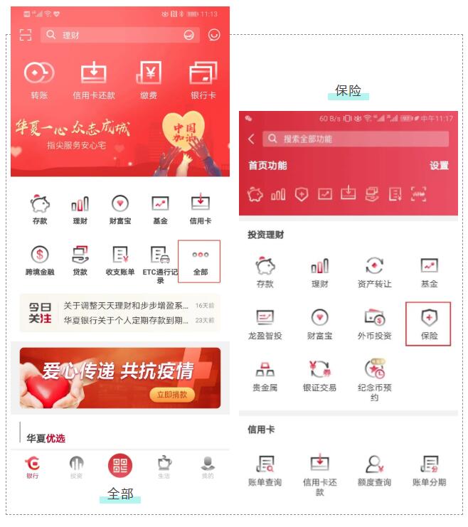 溫馨提示:如果您尚未對您及您的家庭做保險配置,在疫情時期可以通過華夏銀行手機銀行APP足不出戶配齊保險保障您只需要打開華夏銀行手機銀行,在首頁通過“全部”菜單,進入“投資理財”板塊,點擊“保險”即可進入保險板塊,按照產(chǎn)品類型、場景選擇您需要的產(chǎn)品進行購買。