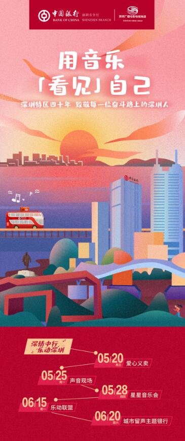 據了解,“深情中行樂動深圳”主題活動將持續至7月,深圳中行將與深圳廣電集團將陸續推出“解鎖深圳成就”H5互動、“星星音樂會”、“聲音現場”、主題TVC、樂動聯盟京東包裹、城市留聲主題銀行等子活動,與深圳市民共同發現城市中的溫暖、奮斗中的故事,為深圳特區四十年唱出贊美的心聲。