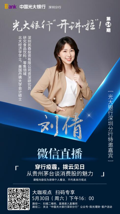 此次,光大銀行深圳分行攜手鳳凰深圳財經,邀請到北大經濟學碩士、美國丹佛大學會計碩士、深圳民森投資有限公司資深研究員劉倩女士,在線為客戶帶來《穿行疫霾,拔云見日——從貴州茅臺看消費股的魅力》主題分享。據悉,劉倩女士關注于食品飲料、零售領域的投資研究。此次分享,她以眾所熟知的茅臺酒為案例,結合A股2000年至2018年漲幅數據、茅臺歷史、品牌發展、銷售渠道、市場占有等多方面,介紹孕育牛股搖籃的消費股投資邏輯,幫助更多客戶在全球受疫情沖擊、經濟不確定時期,了解A股牛股市場邏輯、知曉投資策略提升個人資產。