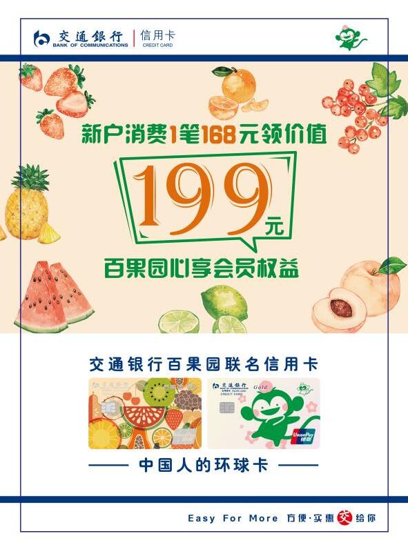 即日起至2020年12月31日,成功核發指定交通銀行百果園聯名信用卡主卡的新客戶,自核卡日起45天(含)內使用該指定交通銀行信用卡滿足1筆單筆為168元(含)以上的消費(不含取現、轉賬),即可于核卡日60天內(含)至買單吧APP使用5積分換購價值199元的百果心享會員權益。