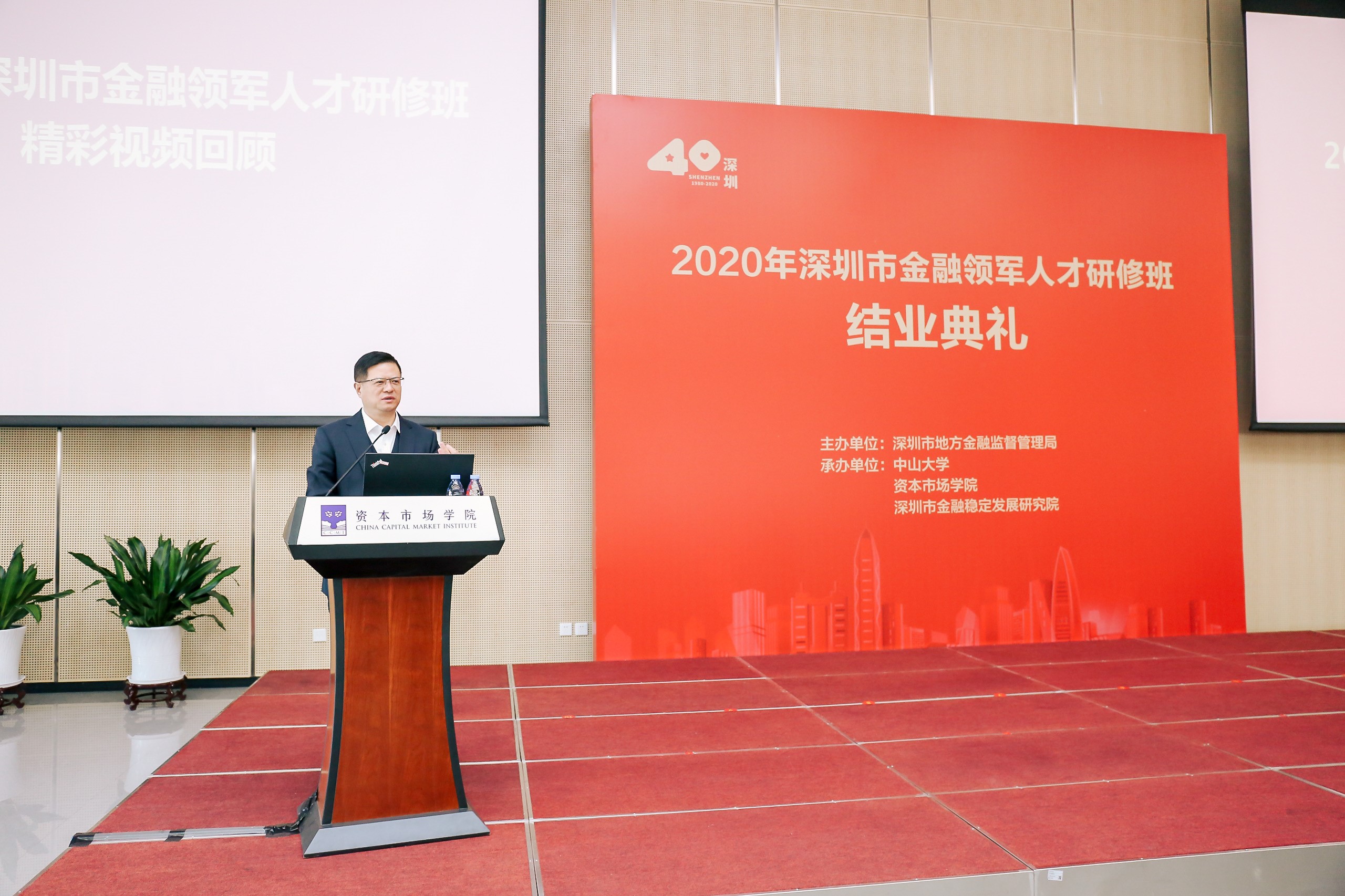 1月30日上午,2020年深圳金融領軍人才研修班結業典禮在資本市場學院隆重舉辦。本期研修班由深圳市地方金融監督管理局主辦,中山大學、資本市場學院、深圳市金融穩定發展研究院共同承辦。市地方金融監管局黨組書記劉平生主持結業典禮并致辭,局長何杰作總結講話。資本市場學院副理事長、深圳市原副市長唐杰教授,資本市場學院黨委書記陳自強、院長金立揚、副院長張韶輝,深圳銀保監局副局長陳飛鴻、深圳證券交易所紀委書記邢力紅,市地方金融監督管理局副巡視員林居正,中山大學嶺南學院院長陸軍教授,以及市委組織部、人民銀行深圳市中心支行、深圳證監局有關領導應邀出席,本期研修班近110名學員參加活動。