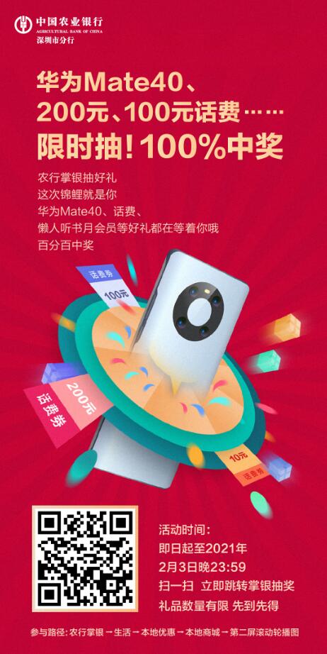 深圳新聞網·見圳客戶端2021年1月2日訊 農歷新年越來越近農行掌銀讓您足不出戶,動動手指抽好禮,這次錦鯉就是你!華為Mate40、200元話費100元話費等好禮限時抽。