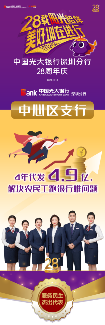 2017年,中心區支行與某建筑工程局達成農民工工資代發合作協議。4年來,該支行深入各項目工地為在深建設者上門辦理開卡、金融知識講座、防范電信詐騙、線上支付等業務百余次。截止2021年11月中旬中心區支行2021年全年新增個人客戶數4422人,4年累計服務個人客戶數11053人,實現代發金額4.99億元,并克服鄭州疫情、洪水天災和跨省異地問題于10月中旬成功實現線上代發業務,解決了農民工跑銀行網點難的實際困難。2021年已累計為各分公司農民工代發工資18279人次,累計新開卡9352張。