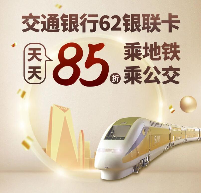 活動內容:在深圳搭乘地鐵及公交出行,使用交通銀行深圳分行62開頭銀聯卡綁定云閃付乘車碼支付,可享“85折乘地鐵及公交”優(yōu)惠活動,單筆封頂優(yōu)惠0.15元至0.6元,每人每天限享2筆,活動期間天天可享優(yōu)惠。每天10000個名額,活動共計 680000 個名額,名額有限,先到先得。