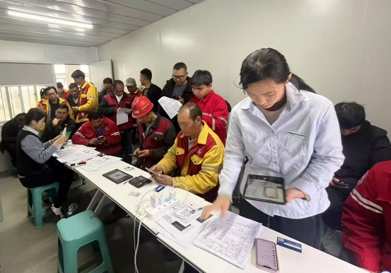 面對困難,陳嘉濤深知客戶需求無小事。他果斷決定帶隊前往現場,為當地員工集中辦理銀行卡開卡及工資代發相關手續。從繁華的深圳到偏遠的高原,路途遙遠、舟車勞頓,加上高原反應帶來的身體不適,讓整個團隊面臨嚴峻考驗。但他們沒有絲毫退縮,抵達后便迅速搭建臨時服務點,投入到緊張的工作中。