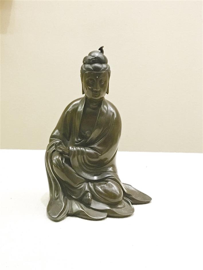 其中,最引人注目的莫過(guò)于展覽海報(bào)上呈現(xiàn)的“景德鎮(zhèn)白釉瓷塑觀音菩薩像”,產(chǎn)于南宋時(shí)期,整尊瓷塑構(gòu)思既簡(jiǎn)約又精巧,以粗線條捏塑形體與衣紋,胸前瓔珞精致,人物形象傳神,充分展現(xiàn)了宋代瓷塑藝術(shù)的審美意韻與高超技藝。令人嘖嘖稱(chēng)贊的還有明中晚期的“銅觀音菩薩像”。此像采用暹羅國(guó)(今泰國(guó))所貢優(yōu)質(zhì)風(fēng)磨銅鑄造,工藝精細(xì),撫之如嬰兒肌膚,嵌銀絲,背后銀絲鑲嵌方章銘款“石叟”二字,當(dāng)出自石叟本人之手。據(jù)了解,石叟為明代晚期鑄銅塑像名匠,僧人身份,現(xiàn)存中晚明觀音銅像中尚有部分“石叟”款,真品珍貴稀罕。