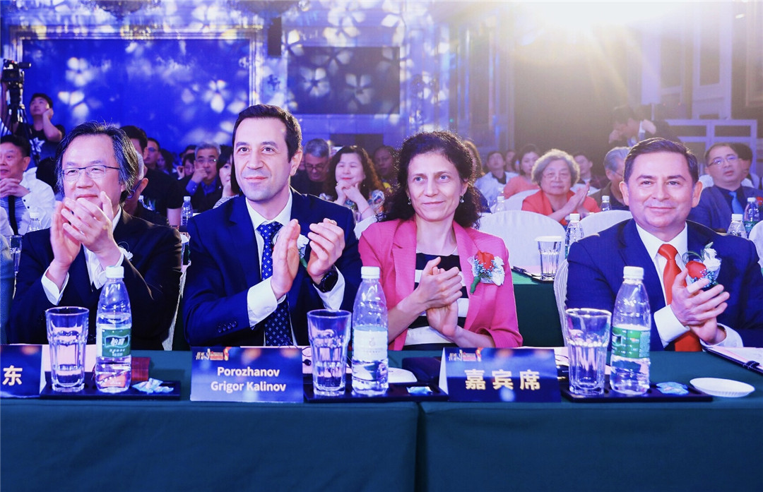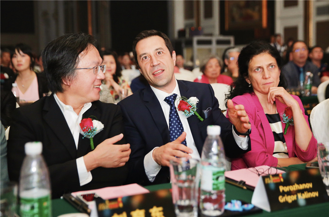 △保加利亞駐中國大使Porozhanov Grigor Kalinov與中俄友好大使、俄羅斯著名影星喜蓮娜為保加利亞DA Architects公司設計師頒發“最佳商業空間設計獎”