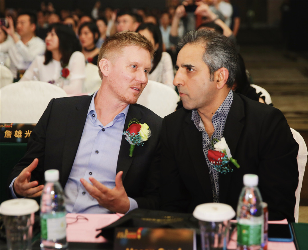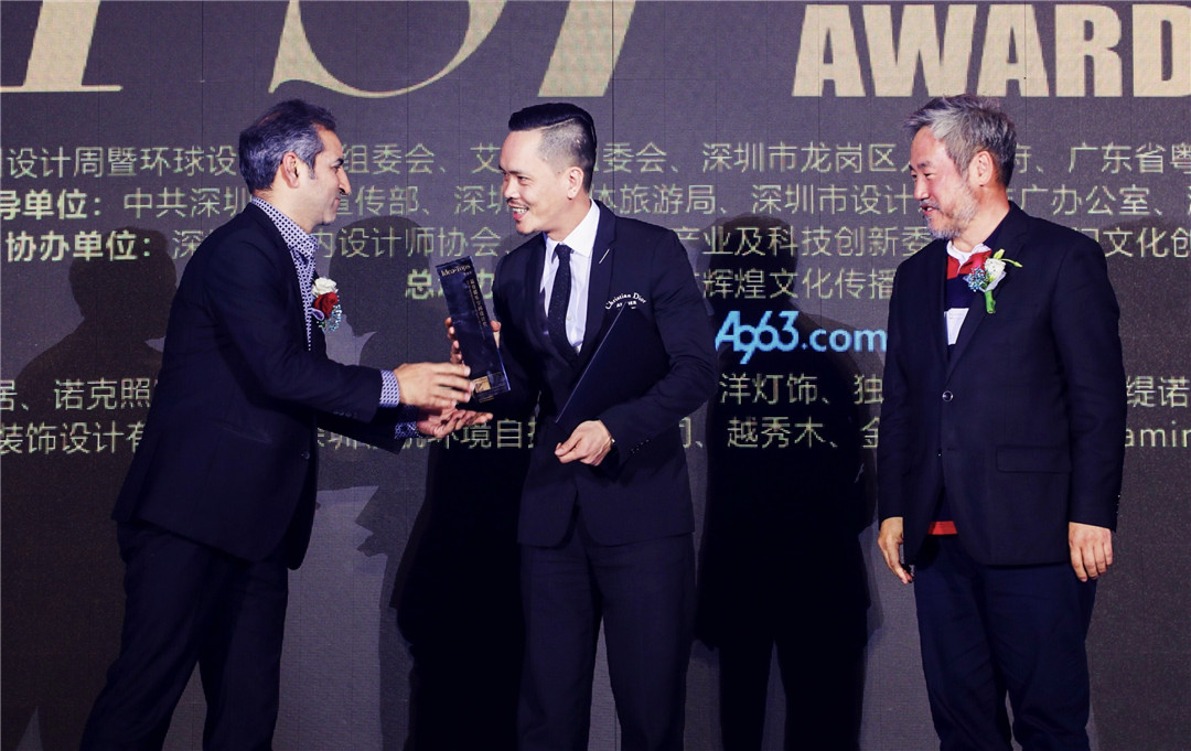 △中央美術學院建筑設計研究院院長、博士生導師王鐵,美國Gensler上海公司總監Hasan Syed為廣州設計師黃永才頒發“最佳娛樂空間設計獎”