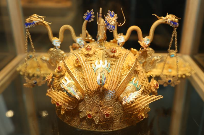 此次文博會,楚釹子品牌展出鳳冠霞帔婚配系列、宅配梅蘭竹菊系列、佛像系列產品等近百余件。其中鳳冠霞帔系列作品,以巧妙的花絲鑲嵌技藝,糅合中國傳統技藝,融入現代婚紗設計理念,打造出流光溢彩、雍容華貴的現代宮廷藝術之美。