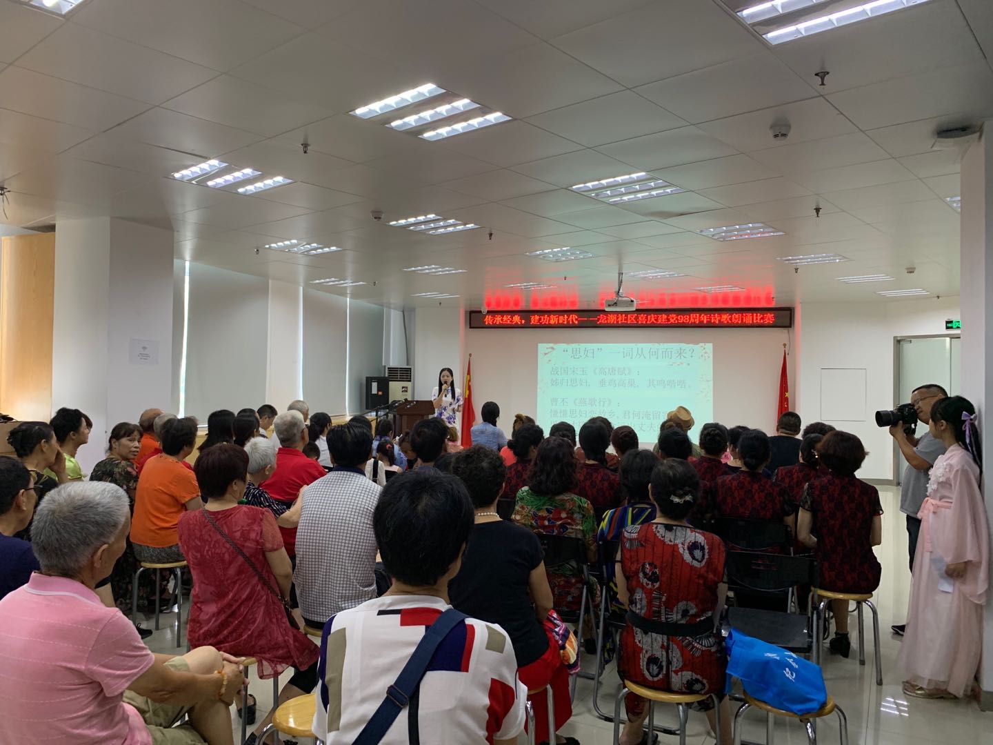 講座開始前,龍湖社區古詩新韻班的學員傾情奉上國學經典新學堂歌——《游子吟》,為本次活動拉開了序幕。接著,龍湖社區的羅黎靜書記深情致辭,為“新時代中華優秀傳統文化”項目走進社區表示榮幸和歡迎,“人生自有詩意,詩意美在四季。今天來到現場的每一個人都心中有愛,腹中有詩,對生命有著詩一般的向往和追求”,喚醒生命中的詩意,活動的意義也在于此。