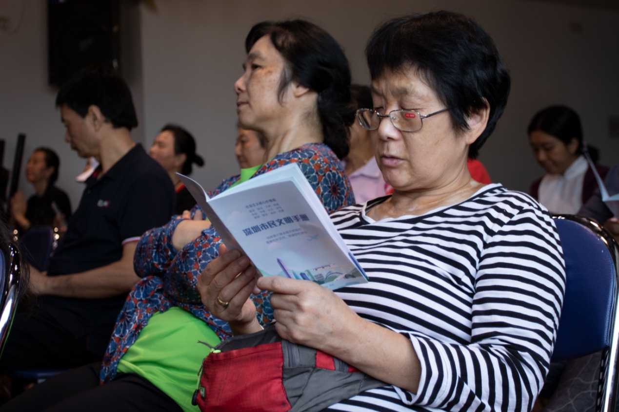 11月13日上午,本系列活動的第六場講座在龍聯社區工作站拉開了序幕。講座開始前,現場聽眾每人手上都拿到一本《深圳市民公約》小手冊和《漢字與修身智慧》學習資料,劉建彪老師首先跟大家互動:“我們需要什么樣的家園?文明城市從哪里開始?”“美麗、溫馨、文明、和諧的家園”,臺下一位叔叔的聲音尤其洪亮,劉老師及時肯定了他的回答。劉老師接著說,文明城市從人開始,人是建設文明城市的中堅力量,他進一步補充道,做文明人的第一步是轉變思想,只有了解并認同文明的重要性,才會自覺地踐行文明禮儀,積極參與城市文明的創建。