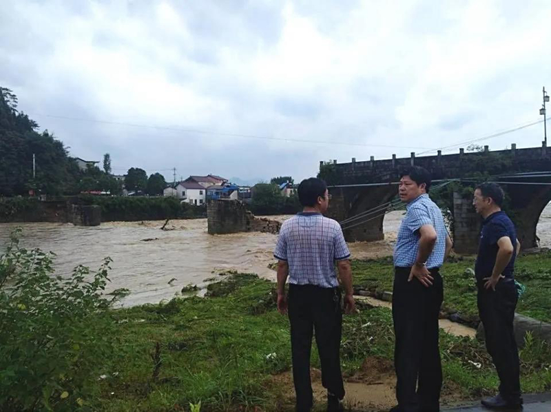 安徽省文物工作人員現場查看黃山鎮海橋受損情況(來源:國家文物局)