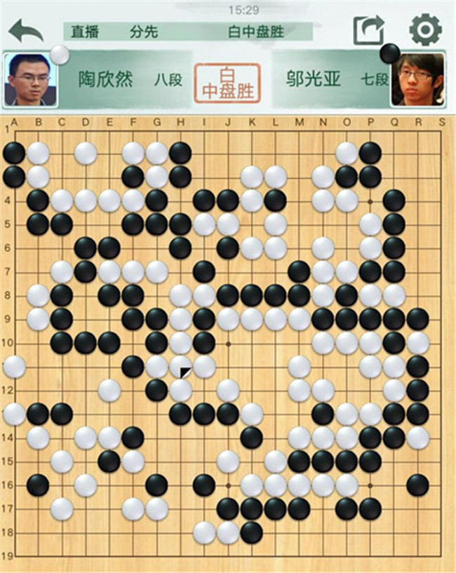 陶欣然執白對陣鄔光亞。黑棋右邊攻擊白棋時候,連續失誤,反被白棋妙手吃通棋筋,黑已無法逆轉局面。有意思的是,賽前陶欣然遲到2分鐘被罰2分鐘,但絲毫不影響他獲勝。