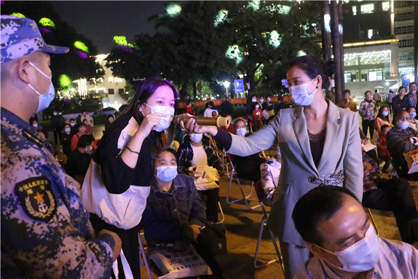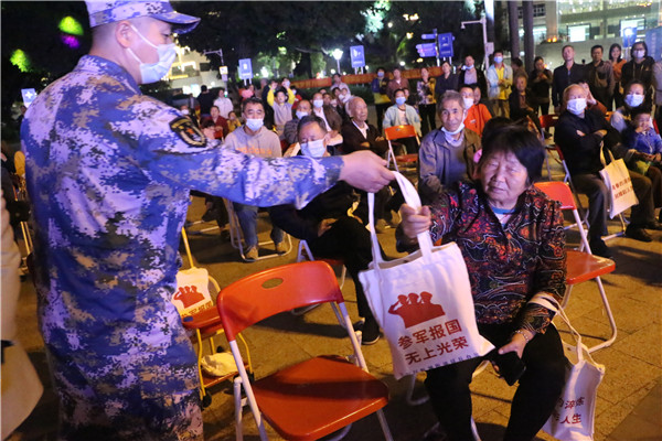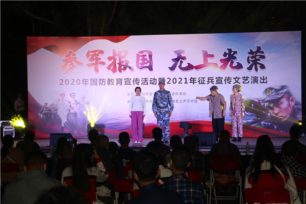 演出中間穿插著跟征兵主題相關的有獎問答環節,普及征兵和國防知識,增強活動趣味性,互動性,現場的群眾踴躍參與答題。
