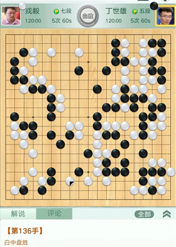第三臺慢棋,由深圳隊戎毅七段執白對陣衢州隊丁世雄五段。開局右下角變化黑棋虧損。之后白棋右上角試應手時,黑棋選擇脫先吃白中間殘子失誤。白棋棄掉幾子在右上黑空先手活出,大幅領先。之后白棋安全運轉直至終局,戎毅執白中盤勝丁世雄。