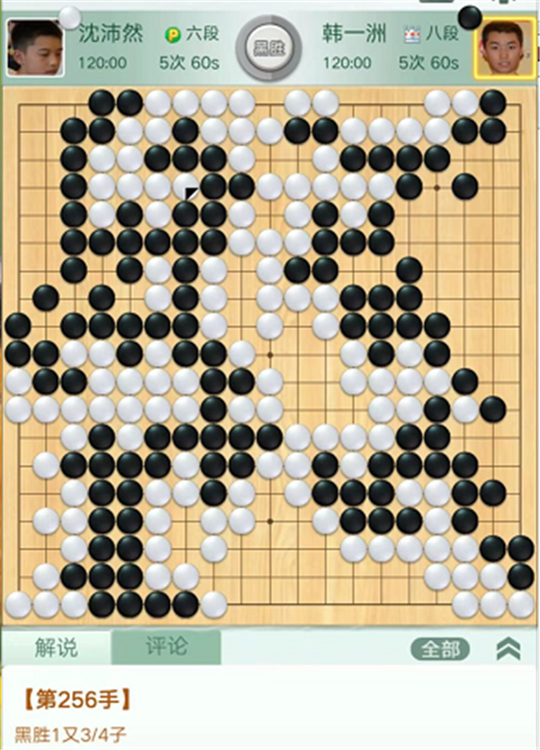 第一臺慢棋,由深圳隊的沈沛然六段執白對陣衢州隊的韓一洲八段。開局白優勢。中盤出于優勢意識,一直沒有在黑棋右邊模樣里面施展手段,被黑圍起大空后局面難以掌握。中央白棋應該對黑棋弱棋發起總攻,實戰貪吃黑三個殘子,導致局面接近。之后白棋形勢判斷有誤,招法松緩,以微弱差距落敗,沈沛然執白1又3/4子負韓一洲。