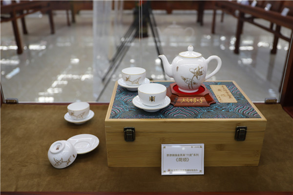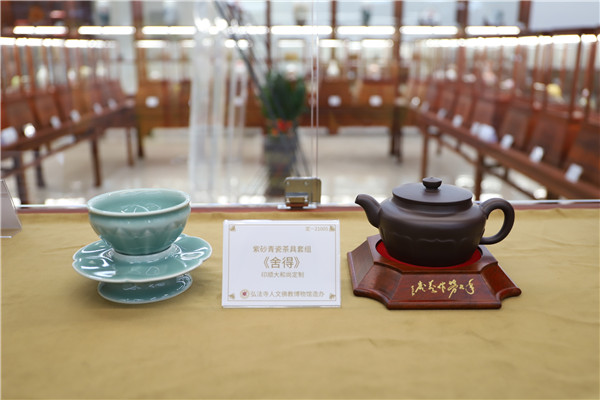 再就是印順大和尚倡意定制的帶有濃厚佛教色彩的生活用具,如紫砂、青瓷茶具套組《舍得》,景德鎮描金茶具“六度”系列《荷順》,均有以佛教意象蓮花為內容的圖案或造型,讓人在使用時頓生清靜心、倍感佛法力,或可為信眾修行悟道助一臂之力。