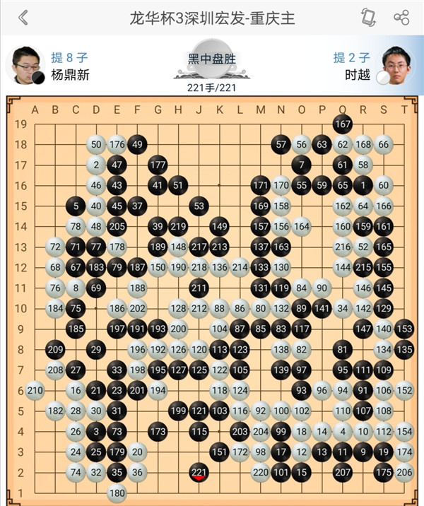 一臺戎毅執黑對陣李軒豪,右上戰斗后黑棋稍有優勢,之后黑棋沖擊中央白棋過分,應該慢慢收官,白棋正確應對,戰斗中便宜后獲得勝利。二臺主將時越執白對陣等級分排名第二的楊鼎新,中盤黑棋打入右邊后形成亂戰,白棋失誤比黑棋更多,戰斗結束進入官子時黑勝勢。