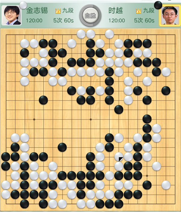 緊接著,時越執黑對陣金志錫一局傳來告負的消息。縱觀全局,開局時黑稍好,但中盤攻擊上邊白棋時候方向錯誤,被白棋聯絡后自身還留下了白棋開劫的隱患。之后黑棋在劫爭中放棄上方黑子在下邊圍出大模樣爭勝。白棋在黑勢中施展手段時黑棋必需尋求凈殺白子。無奈周邊不夠厚實殺不掉,遂于174手時認負。