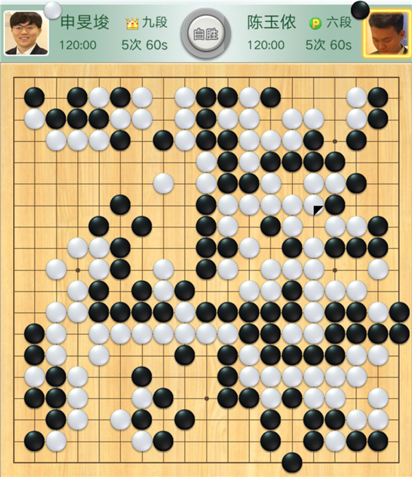 本輪比賽,率先破局取勝的是二臺外援主將申旻埈。是局,申旻俊執白對陣三連勝的小將陳玉儂。黑棋開局沖擊右下白棋急躁,白棋處理好后局面大幅領先。黑棋之后在左邊與上邊奮力拼搏,白棋冷靜應對,輕松獲勝。行棋204手。