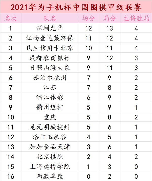 2021華為手機杯中國圍棋甲級聯賽第四輪深圳龍華3:1勝衢州爛柯