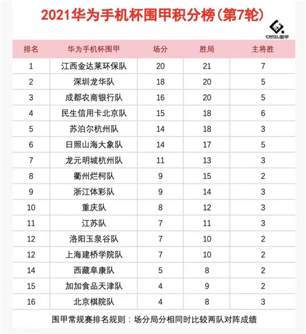 見圳客戶端?深圳新聞網2021年6月8日訊(記者周錦春)華為手機杯男子圍甲聯賽16支隊伍今日繼續在浙江長興捉對進行第七輪的廝殺。繼第二階段首輪失利后,今日的深圳龍華隊似乎找回了第一階段五連勝的感覺,以3:1戰勝北京棋院隊,從昨天的積分榜第三位前進了一步,重拾升勢位居第二。江西隊依然神勇,以3:1擊敗洛陽隊,繼續領跑積分榜。