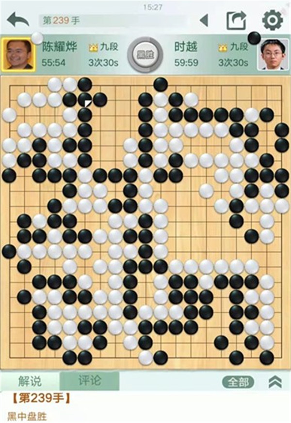 時越快棋執黑對陣世界冠軍陳耀燁。中盤黑棋在右邊白勢中試應手,白棋應對松緩,被黑棋先手便宜十幾目棋,黑局面領先。之后黑棋行棋嚴謹,中盤獲勝。