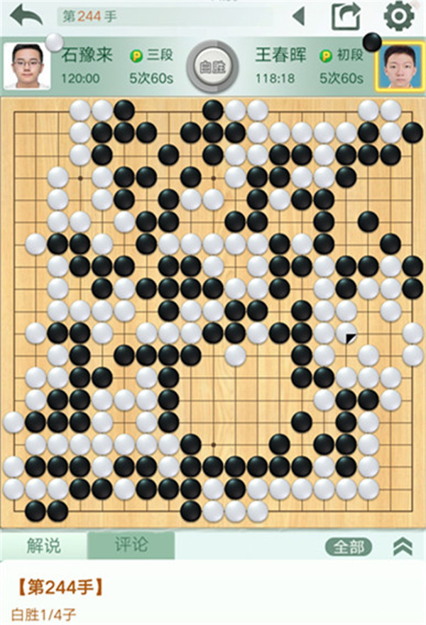 石豫來執白對陣小將王春暉。雙方錯進錯出,最終黑棋小官子出現問題,白棋幸運1/4子獲勝。