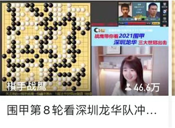 形勢大好,深圳龍華隊網上直播合作人,虎牙直播間圍棋知名主播戰鷹這里自然也是“門庭若市”,人數沖上46萬大關。賽后,石豫來到直播間作客,小帥哥自然受到熱捧!深圳龍華隊的后續戰況仍將在這里直播哦,關注戰鷹講棋,人美、棋強、口才好,是知名的圍棋主播。