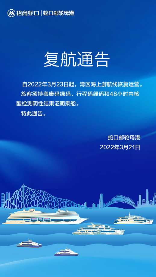 讀特客戶端 ·深圳新聞網2022年3月21日訊(記者 田志強)記者從招商蛇口郵輪母港獲悉,自3月23日起,灣區海上游航線恢復運營。搭乘該航線的旅客須持粵康碼綠碼、行程碼綠碼和48小時內核酸檢測陰性結果證明乘船。