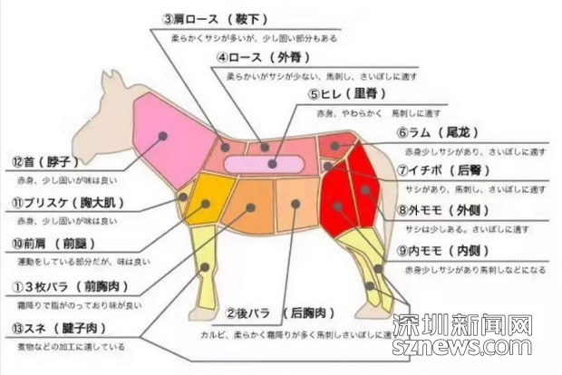 馬能做成刺身的部位相當的有限,依照油花分布大致可以分為腹肉(卜口)、霜降、赤身等不同的等級。其中最稀有的的“三枚腹”肉,一匹五百公斤的馬只能產出大約5-6公斤,肉質口感近似于藍鰭金槍魚中腹肉。