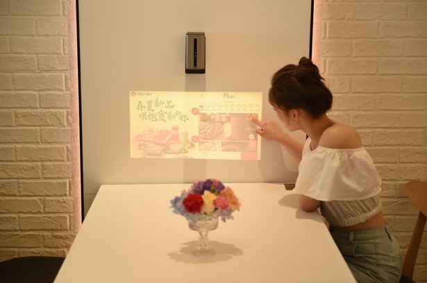 除了“情緒地帶”,智慧餐廳還提供了多元化的互動服務。門店等位區有一整面具有奇幻動感效果的投影互動墻,通過獨特的觸摸啟動可以探索必勝客的比薩從原料種植、加工、生產,一直到制作成品、奉客、外送等一系列過程,為顧客提供趣味十足的多感官虛擬互動體驗,讓無聊的等位時間也變得興味盎然。