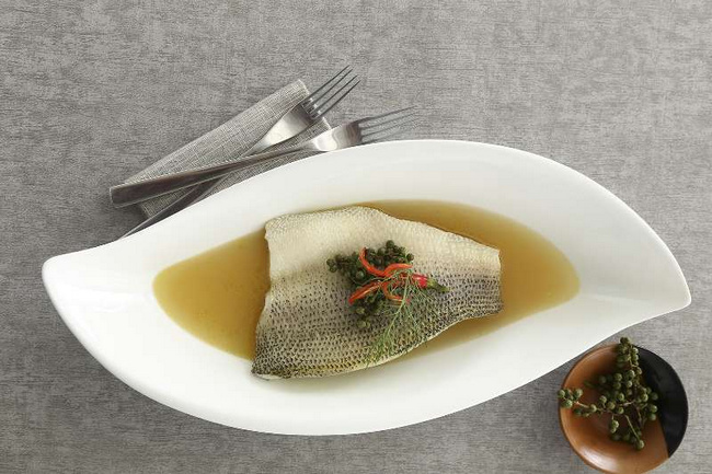 區別于充斥著辣椒與熱油的傳統水煮魚,梧桐 PLUS 的 fusion水煮魚外表清新,口感麻辣。食材選用三斤左右的上等淡水鱸魚,清晨宰殺,剔骨后整場取肉,再經過高溫蒸制,保證魚肉肉質嫩滑松軟。并不像傳統的水煮魚采用的“湯菜”的方式,fusion水煮魚采用肉料分離的烹飪方式。魚湯經過麻椒、辣椒的熬煮而變得味道濃郁,過濾后僅留清爽的湯汁,單從視覺上根本無法判斷蘊藏的奇妙味道,這也正是這道招牌菜的精妙之處。盛盤后的fusion 水煮魚猶如一道藝術品,造型簡約充滿意境,清亮的魚湯入口瞬間酸辣感通透口腔,脫離了紅油浸泡的濃郁麻辣口感,更加健康養生。