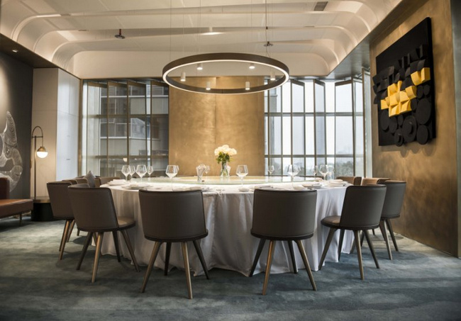 以黑色和金色為主色調的梧桐PLUS,選用流動的線條對餐廳空間進行分割。桌與桌之間的距離保證了食客對話的私密性和安全性。即使沒有預定到包廂,也不用擔心旁邊食客的閑聊會影響到彼此。
