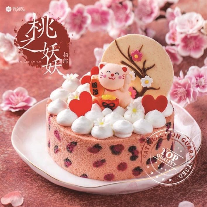 據(jù)黑池產(chǎn)品經(jīng)理介紹,“招郎蛋糕”是黑池最近重磅推出的新產(chǎn)品。蛋糕周圍覆盆子果干點(diǎn)綴而成的粉色豹紋,讓整個(gè)蛋糕充滿了野性魅惑又不失少女甜美。最為吸引眼球的,則是蛋糕表面,被桃花簇?fù)碇囊恢弧罢欣蛇鳌薄_@只軟萌可愛的“招郎喵”,象征著,對得到這款蛋糕的人,最美好的祝愿,希望他們能夠遇到最好的愛情,找到心目中的那個(gè)他。
