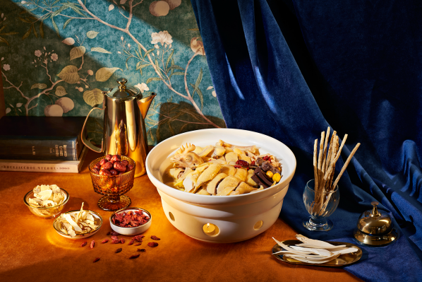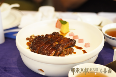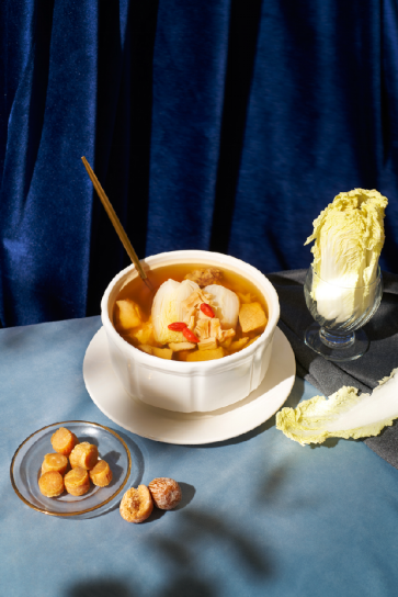 瑤柱菜膽燉土豬展湯,80頭干瑤柱經過發泡,和優選食材的土豬肉,娃娃菜一塊入燙盅燉6小時。水甘味甜,有滋補清潤作用。